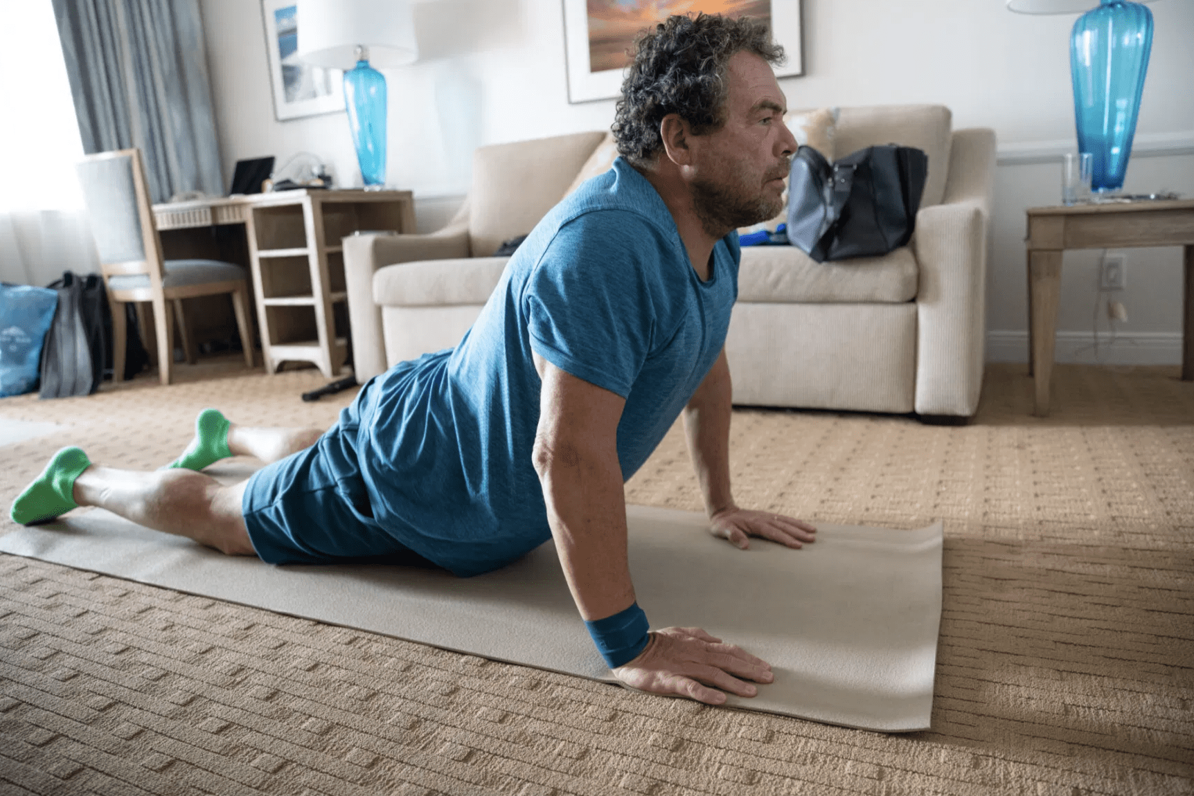 His coaches assure that he was another person at the time. Now, he lies on the carpet of the hotel room and, as he does a plank, the shadows of his biceps and triceps appear on his arms. “I don’t have a six-pack, but I have muscles exactly where I need them,” he says in his deep voice, as if it came from the depths of the ocean.