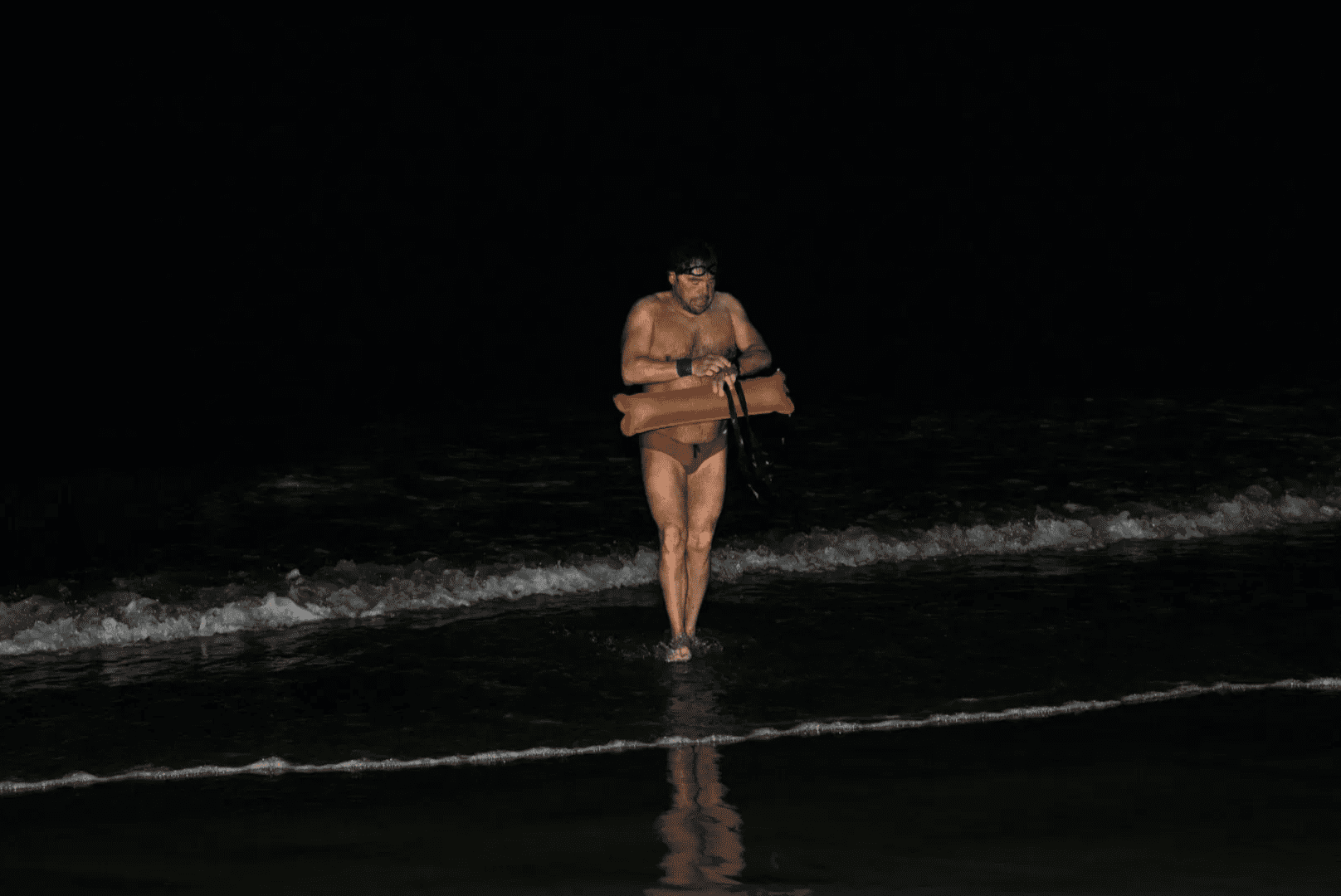 The third swim started at three in the morning. Argüelles assures that he is good at sleeping, even for three hours. Rafa, as he calls his coach, is the only one accompanying him until the water covers their feet. In a low voice, less than an arm’s length away, he goes over the plan with his athlete one last time: “Ten minutes of R3 and then you repeat, R4, R2,” he says, referring to swimming speeds, as the waves break on the shore and obscure his words in the dark.