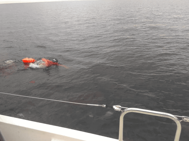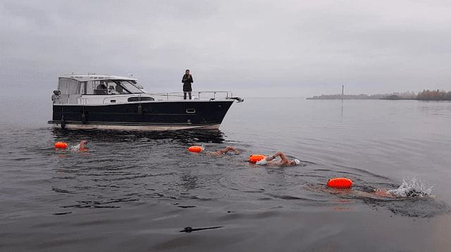 The foursome started off with 30-minute legs in the Baltic Sea. The water temperature started at 7°C and never rose above 10°C. Their major challenge was the short recovery time between each leg that was repeated 7 times without hot tubs and saunas onboard. The men prepared for each leg with the help of an onboard doctor of physiology who cleared each swimmer before they entered the cold gulf each time.