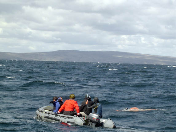 He swam 8K in 90 minutes between Gran Malvina and isla Soledad – the first time anyone had swum between any of the 778 islands in the archipelago in the South Atlantic Ocean, located about 290 miles (460K) from the coast of mainland South America.