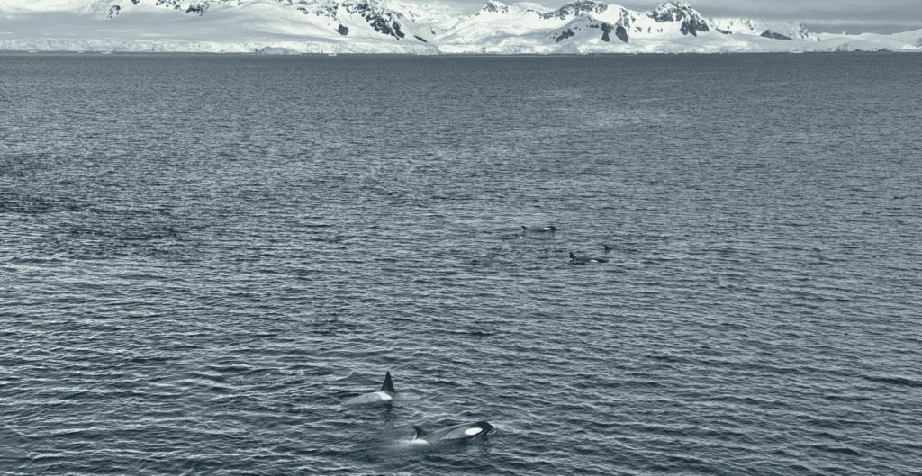 Barkai wrote about the unexpected orca encounter, “[It] was a very very special day in frozen Antarctica. First, all swimmers completed their 1000 meters in 1°C water in the amazing Port Lockroy. And than, an hour later out of the frozen deeps, a pod of dozen majestic Orcas just popped up around us for over an hour. All around us (we were on ship) playing, planning, getting a poor seal, breaching and just being orcas. Two calves, a big family. For me, seeing this is a dream come true: seeing these epic majestic mammals, up close and personal in Antarctica.”