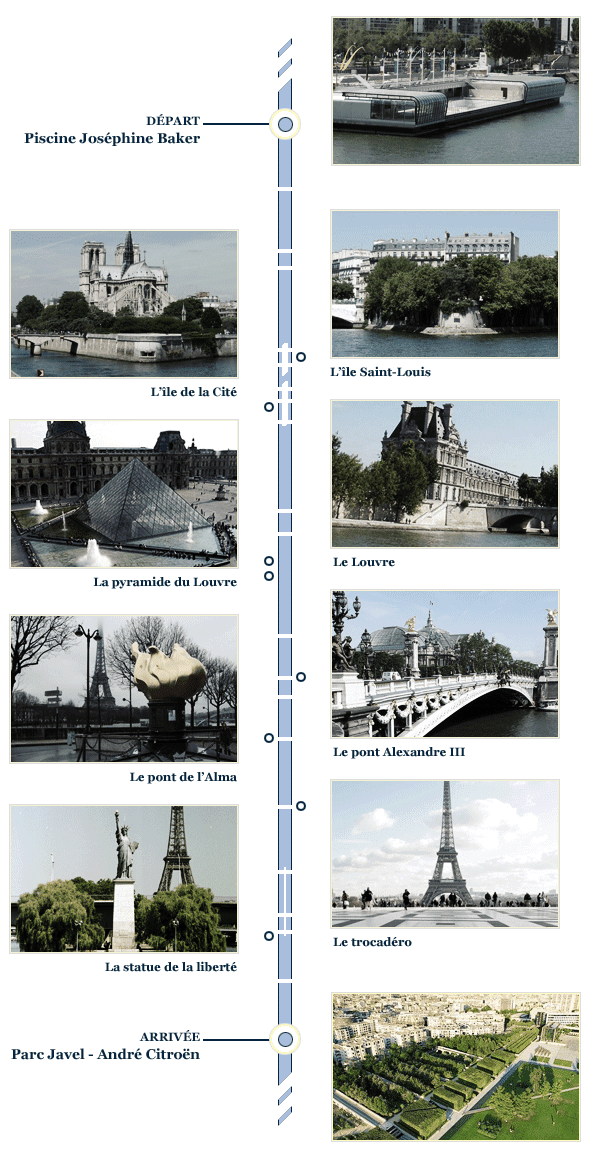 The unique aquatic challenge is combined with a tour of Paris that will take swimmers from the Josephine Baker swimming pool to the Parc André Citroën, via the Louvre, the Place de la Concorde and the Eiffel Tower.