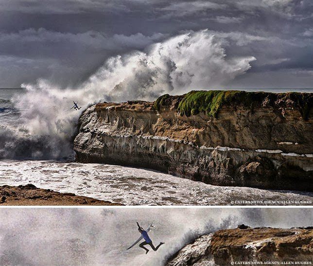 Photographer Allen Hughes captures a surfer who is late to his surfing competition and is willing to take a courageous jump into the open water.
