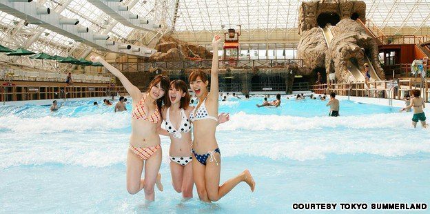Below is Tokyo Summerland’s wave pool on a typical summer day. Can you find those 3 young women in the middle of that pool?