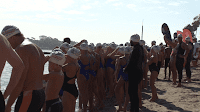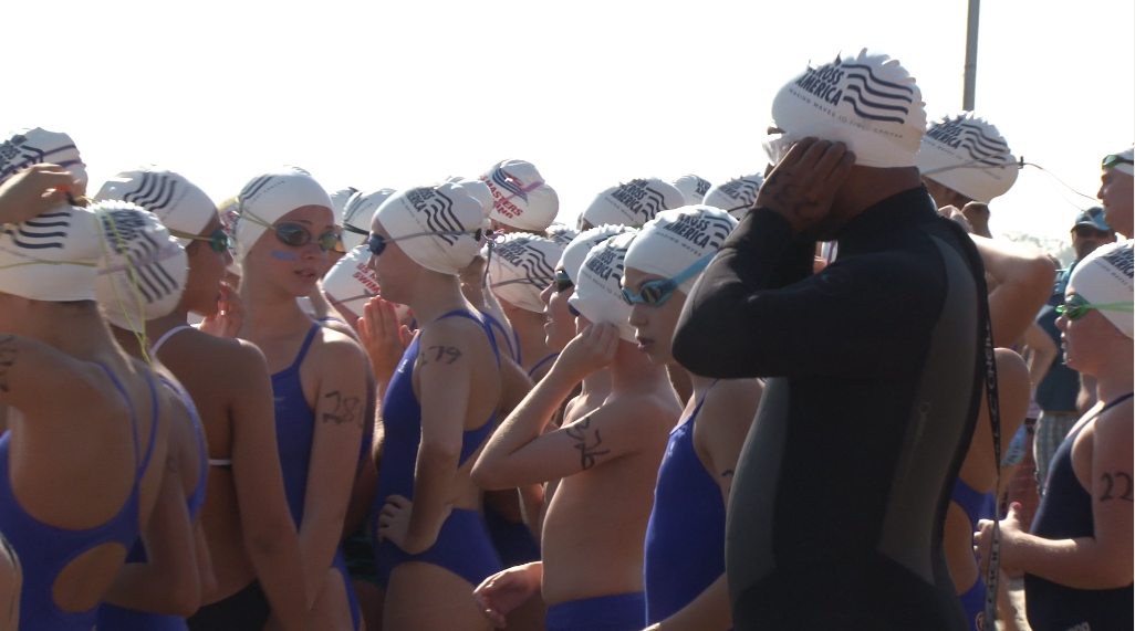 Photos were taken of the young swimmers from the Mission Viejo Nadadores attired in their natural bioprene who were lining up at the start of the Swim Across America event in Long Beach.