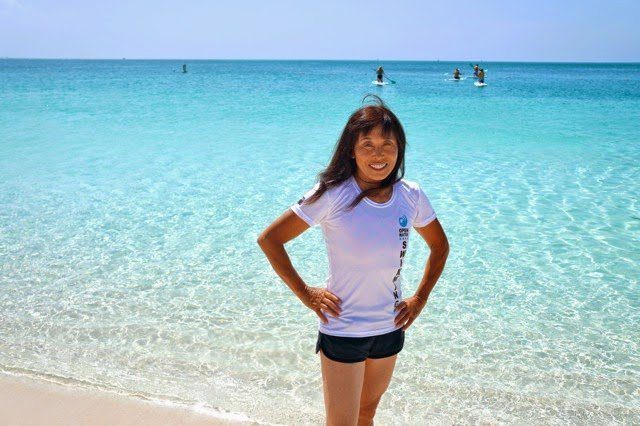 Above photo shows Yuko Matsuzaki speaking at the International Marathon Swimming Hall of Fame induction ceremonies at the United Nations. Lower photo by Ben Stubenberg shows Matsuzaki on the shoreline of Turks & Caicos at the Grace Bay Club in Provo.