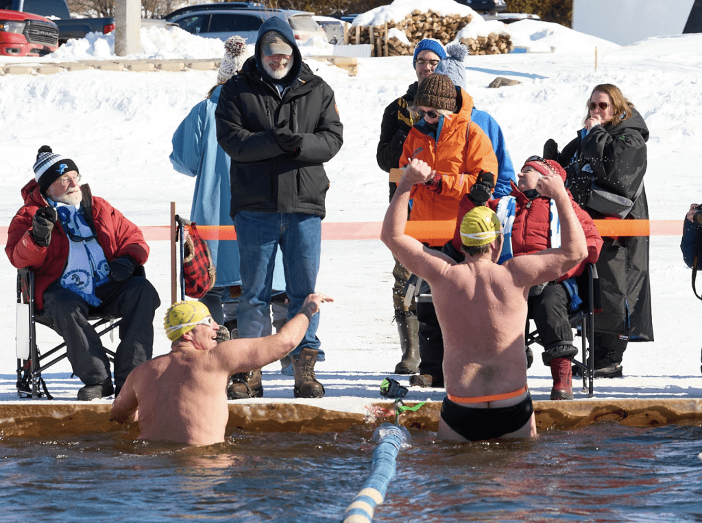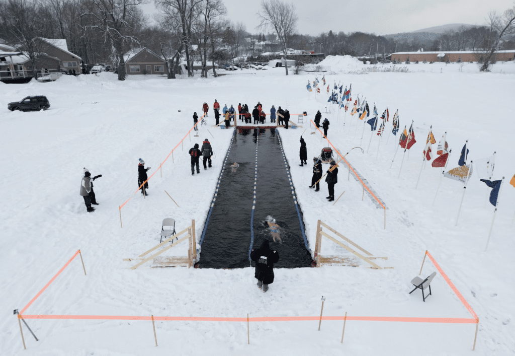 Volunteers [shown above] at the 2025 Memphremagog Winter Swimming Festival include from left to right: unidentified individual, Joey Pavey, Cecile Berne, Jerry Bond, Rob Andersen (with the hook), Gordon Lang, Greg O’Connor, Chuck Goulding, Daniela Klaz, Elaine Kornbau Howley, Teresa Gerarde, Pat Goulding, Denis Chenette, Don Houghton, Jr., Lara Hendricks, Andrew Wallace, John Gale, Robert Bailey, and Brenda Perks. Photos courtesy of Robbie Bailey.