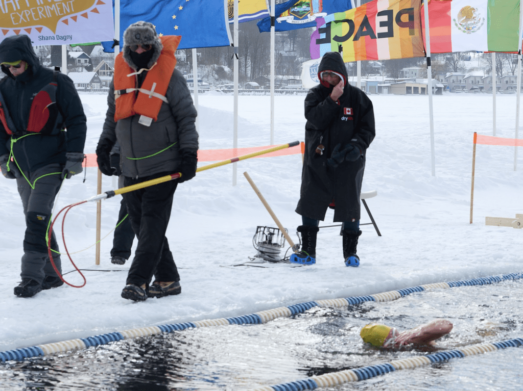 “These are just some of our hearty, battle-hardened, Low Society Hookers, Skimmers, Escorts, Pimps, Cutters, Jumpers, Strippers, Timers, Go Go Girls, Gunners and Pole Dancers, braving 10°F and 20 mph winds for hours to make a 25m pool happen in the middle of Lake Memphremagog in March,” explains visionary race director Phil White. “They get s**t done.”