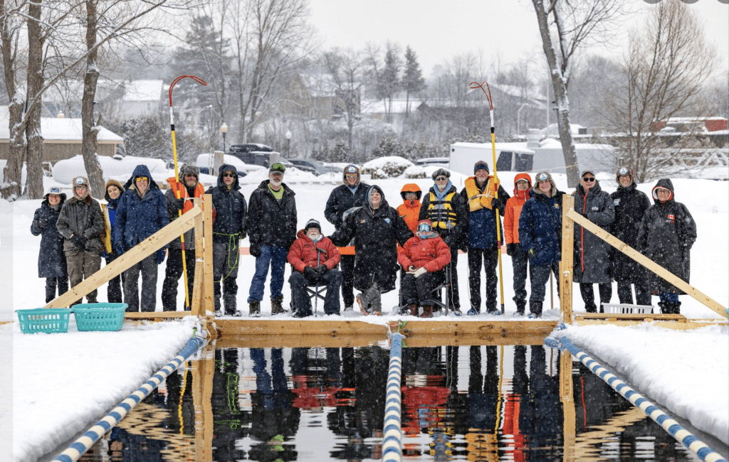 Volunteers [shown above] at the 2025 Memphremagog Winter Swimming Festival include from left to right: unidentified individual, Joey PaveyCecile BerneJerry BondRob Andersen (with the hook), Gordon LangGreg O’ConnorChuck GouldingDaniela KlazElaine Kornbau HowleyTeresa GerardePat GouldingDenis ChenetteDon Houghton, Jr.Lara HendricksAndrew WallaceJohn GaleRobert Bailey, and Brenda Perks. Photos courtesy of Robbie Bailey.