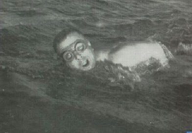 Jason Zirganos, 48-year old retired army major from Volos, Greece, swam the Catalina Channel from the island to the mainland in 17 hours yesterday. Greased from head to toe, Zirganos dipped into the stormy waters off Howland’s Landing at approximately 8:30 P.M. Sunday. Four boats accompanied the veteran swimmer as he battled huge ground swells and choppy waters. Several times during the night rain-drenched boats lost sight of the swimmer. Zirganos was only a mile from the mainland 12 hours after his start. Bucking a severe tide at that point, it wasn’t until five hours later that he came ashore on the rocks at Portuguese Bend…”