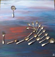 “As serene as it is magnificent, the ocean at night ripples with silvery reflections as the waves dance along the shore. The actual silverware on this painting will catch and play with the light just as the water at night might.