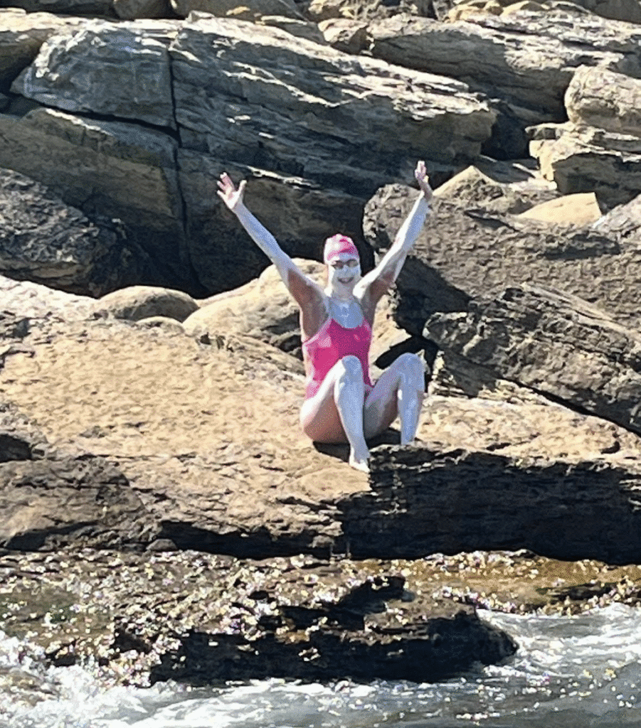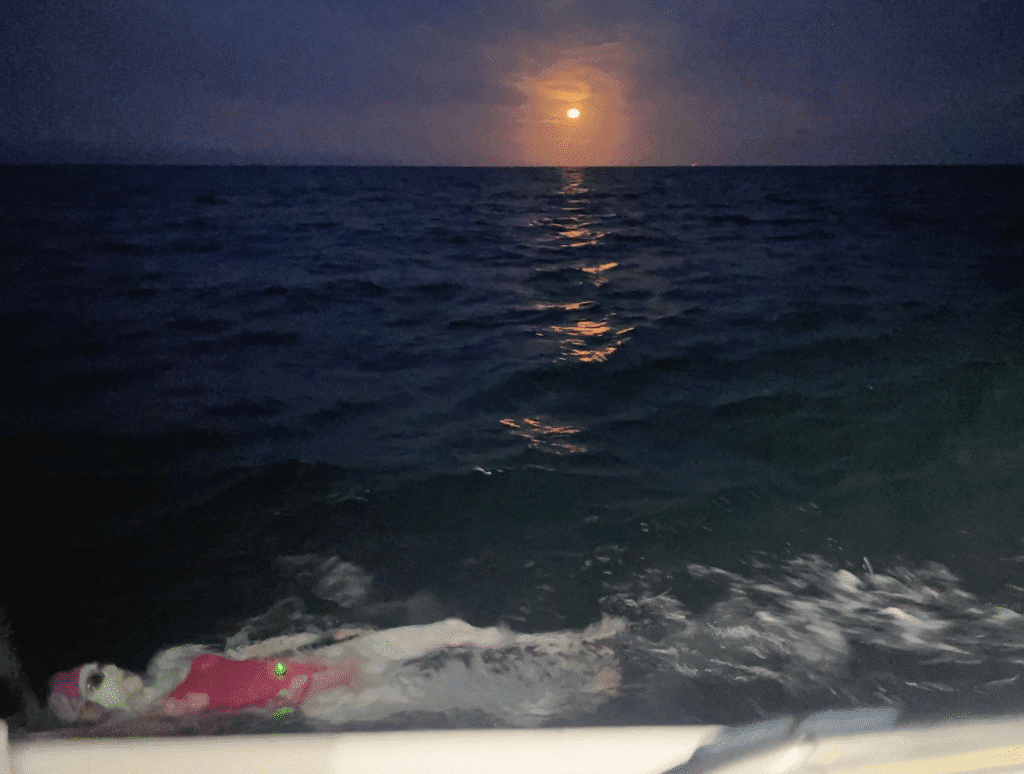 Dr. Kieras explained her finish of the backstroke finish, “There was a formal conversation leading up to the swim about start and finish rules. I was instructed by the observer to swim backstroke until told by the co-pilot, Sean Marsh (in the dinghy) to turn over and climb onto the rock (not swim). I was told that I must not attempt to climb the rock backwards and this was not an option.