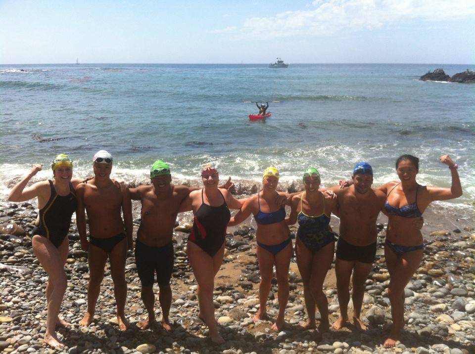 Photo from left to right: Kate Martin, Brandon (Pace Swimmer), P.K. Gauchan, Robyn Beresh, Alicia Bartley (Team Captain), Sherry Winston, Steve Klein, Kayaker Jasimine Kung and in the background in the red kayak, Bob Beresh, with Captain Greg Elliot of the Bottom Scratcher and Observers Don Van Cleve and Vanessa Mesia from the Catalina Channel Swimming Federation.