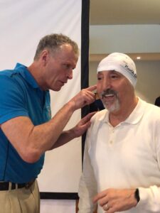 Fellow Turkish channel swimmer Emre Deliveli explains, “Alsaran crossed the North Channel on July 29th 2019, becoming the oldest man to do so at the age of 58. He entered the Guinness Book of World Records with this crossing as well as also became the first Turk and Muslim to cross the North Channel. Alsaran received his North Channel swim cap number 67 at the Irish Long Distance Swimming Association awards ceremony on February 29th [shown with Ned Denison on left].