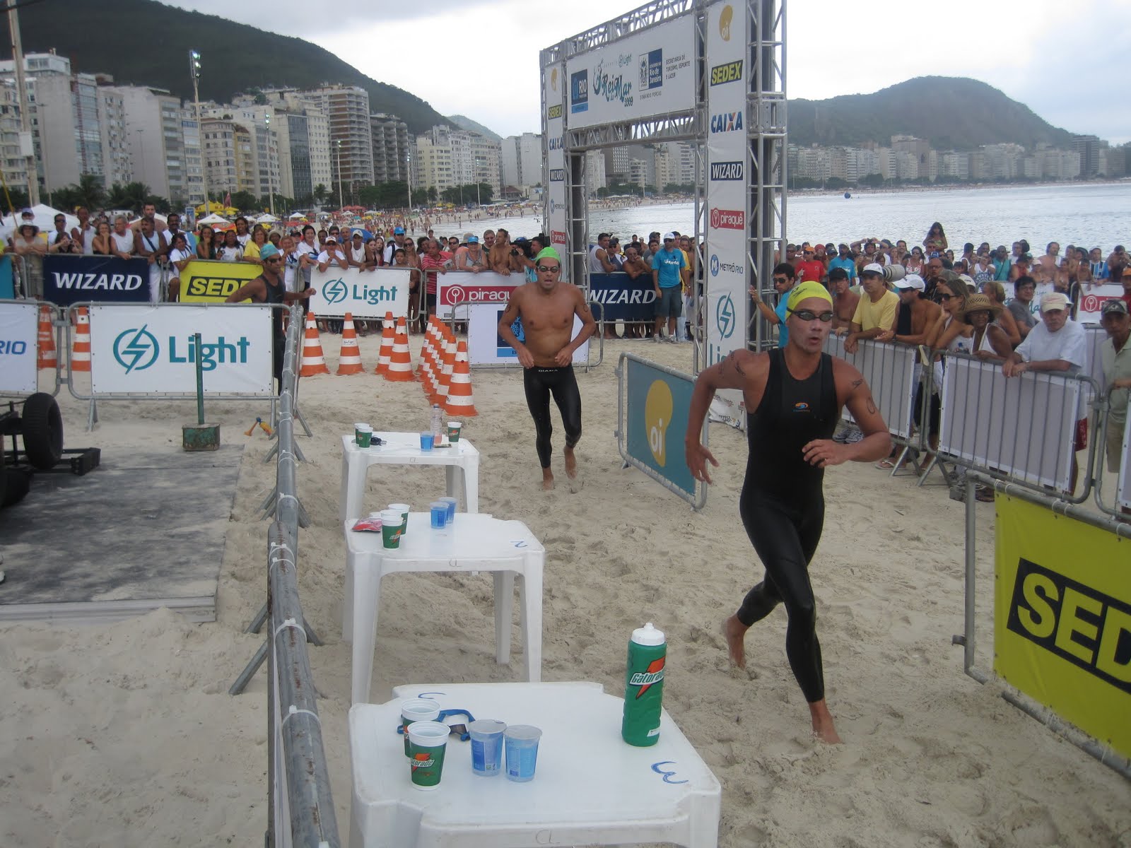 They put the feeding stations on the soft sand beach so the athletes have to hustle out of the water and run past the cheering crowds and pulsating music by Zero Calibre who created the event’s theme song.