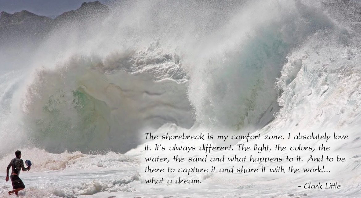 Flip through his 2020 Calendar or view his colorful prints or his photography books, like The Shorebreak Art of Clark Little, and you cannot helping staring at the majesty of his artwork and the beauty of the ocean. His daring is beyond words.