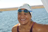 International Marathon Swimming Hall of Fame Honor Swimmer Nora Toledano (left) is shown exchanging with former Olympian Patricia Kohlmann.