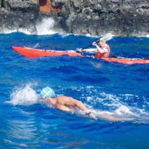 Alex, who has been competing for 30 years, felt the timing was right to not only fulfil a lifetime wish to visit Pitcairn, but also to focus his mind upon recovering from an injury. Having recently undergone shoulder surgery, Alex decided that to motivate himself to work on his physical therapy to recover from this injury, he would commit himself to the challenge of being the first person to swim entirely around Pitcairn Island. With the support of locals who travelled nearby in boats, and despite rough weather Alex achieved his goal with a remarkable time of 2 hours 37 minutes and 45 seconds.