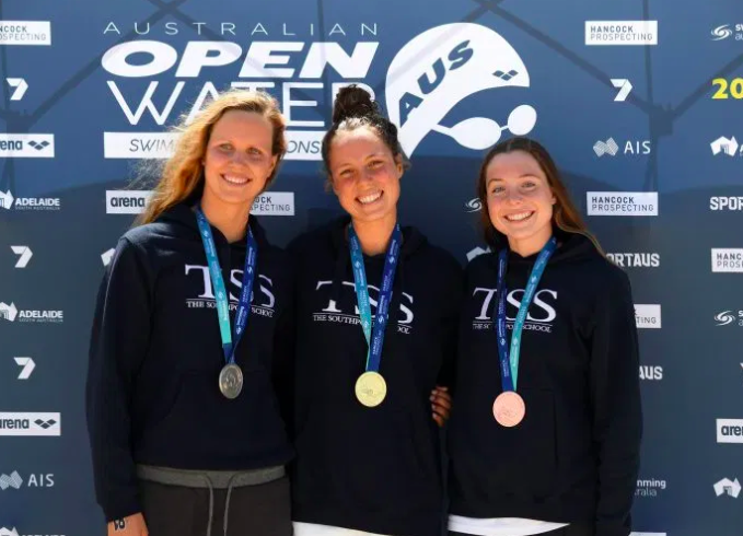 Courtesy of Ian Hanson, Hanson Media. Photo of TSS Aquatic teammates (left to right) Moesha Johnson, Maddie Gough, and Bianca Crisp (bronze). Photo Courtesy: Swimming Australia (Delly Carr). Guthrie courtesy of Delly Carr of Swimming Australia, Brighton Beach, Adelaide, Australia.