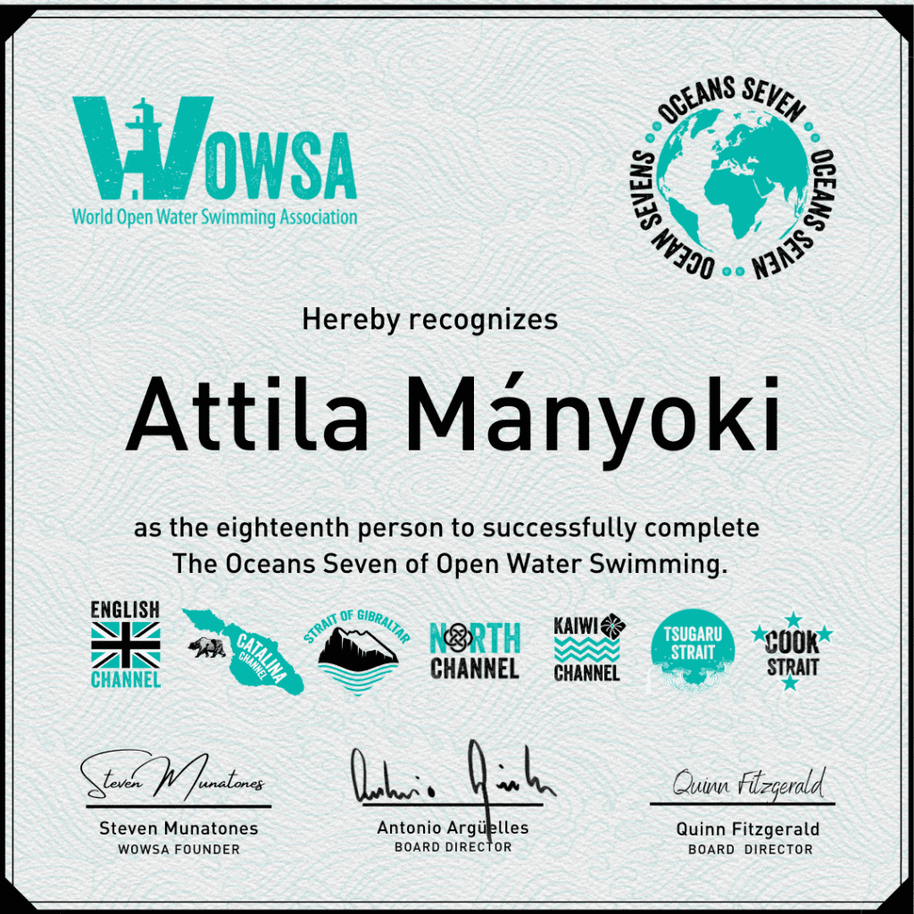 International Marathon Swimming Hall of Fame Honor Swimmer and Oceans Seven swimmer Mányoki was interviewed by International Marathon Swimming Hall of Fame chairman Ned Denison and talked about a few of Attila’s 250 marathon swims over his eventful career on WOWSA Live back in April 2020.