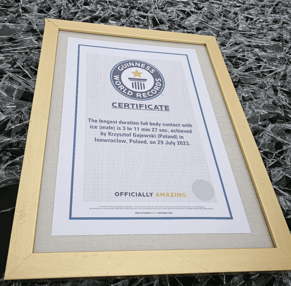 - Krzysztof Gajewski swam 6.0 km over 1 hour 46 minutes in 4.84°C water and 1.00°C air in a pool in a lake in Poland in 2023