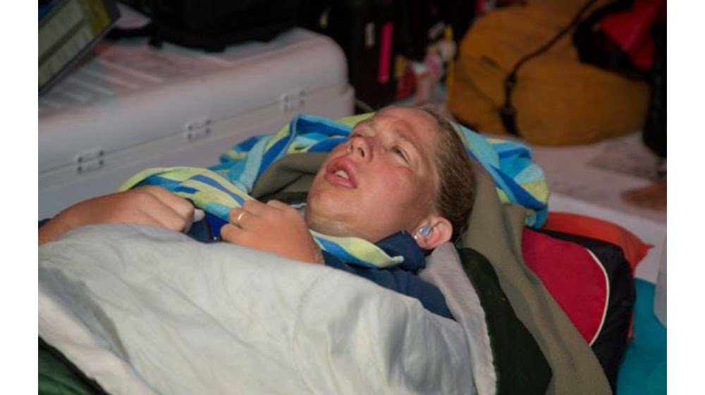 Photo shows Chloë McCardel soon after the completion of her 124.4 km (77.3 mile) swim from Eleuthera Island to Nassau in the Bahamas and before her 6-day recovery in a local hospital due to the large number of jellyfish stings she endured during her 42 hour 30 minute marathon.