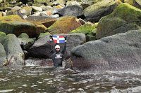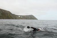 On behalf of the United Nations for the Millennium Development Goals, he culminated his project in the 3°C (37.4°F) waters between Little Diomede in the United States and Big Diomede Island in Russia, uniting the two continents and two countries, as Lynne did in 1987 (see below).