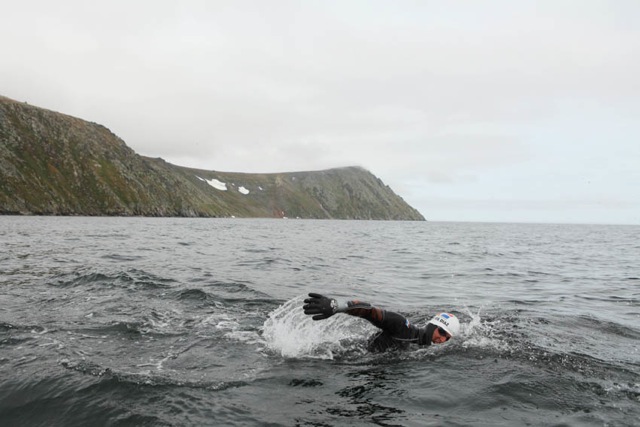 “The swim was very cold…3°C in most places with very strong currents, especially very strong from south to north. I had to fight it for more than half way so I wouldn’t miss Little Diomede [on the American side]. We just made it close to the north corner in 1 hour and 5 minutes. I was very tired to fight with those strong currents in my wetsuit.”