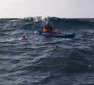 “It was tough swim. The wind and the 1 meter waves came at me from all directions for a third of the swim. This made my shoulders and wrists ache. Then I had to negotiate 1-2 meter waves pushing me into shore for 9 km. The scariest part was landing in the 2 meter surf.” The crew and Dr. Korzekwa were enchanted by a pod of over 100 dolphins that swam with them.