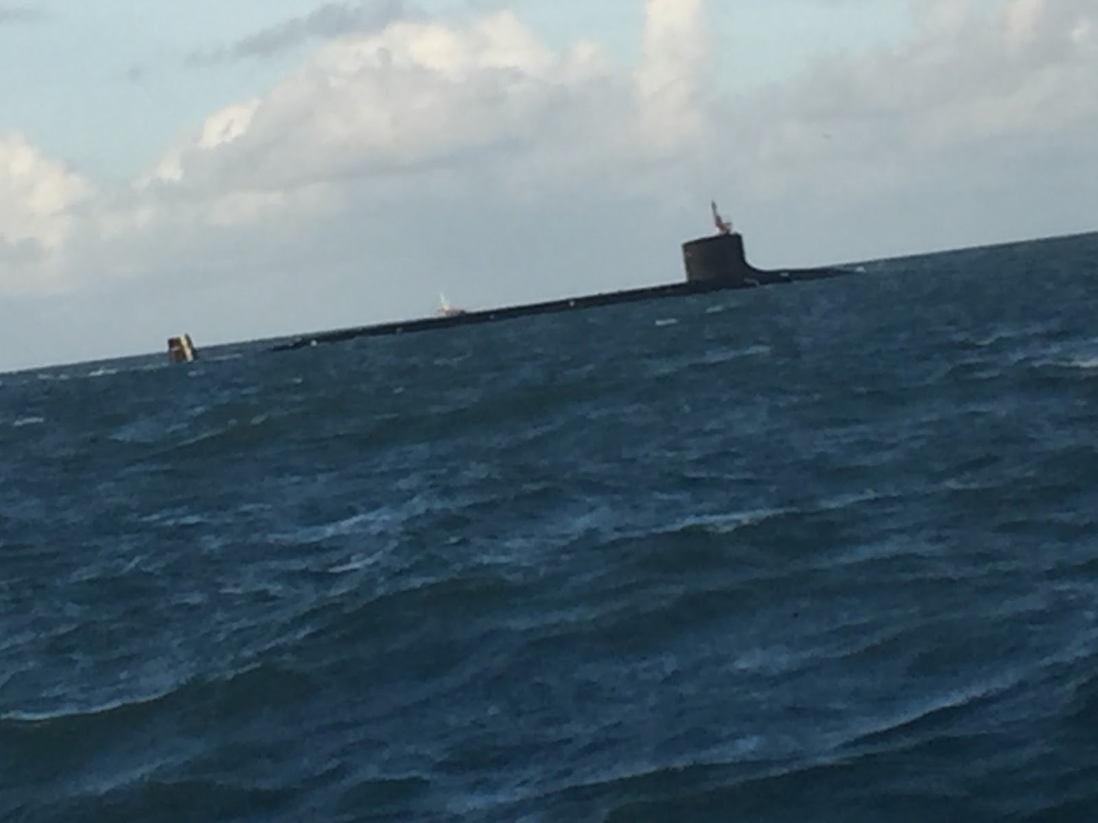 As Hooper’s escort boat [see top photo] pulled into Dakar for the Swim The Big Blue, a transatlantic swim from Senegal to Brazil, Figge and her escort captain Tamas Hamor noticed a submarine surface right in front of them before the start of their Bermuda Triangle Swim [see second photo].