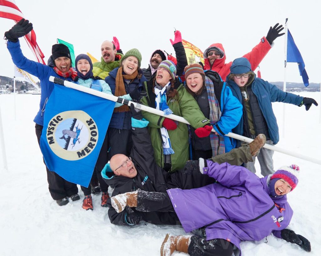 White also recognizes volunteer who participate with special diligence and a genuine joy. “We call it the Bob Kraft Happy Hooker Award. A few years ago, we extended it to all volunteers, not just Hookers, but also Strippers, Escorts, Gunners, Skimmers and Huggers. This year the award went to Karina Palmorino along with a walking stick, hand carved by our community’s beloved, retired gynecologist, Bill Peck. Karina first volunteered for the Games as a long distance yacker at Kingdom Swim. She’s also a winter swimmer. She then volunteered as a Stripper. Recently she has also signed on as an escort pilot for In Search of Memphre, our swim the length of Lake Memphremagog between Vermont and Quebec. She is part of our family now and her broad smile is never far from the moment.”