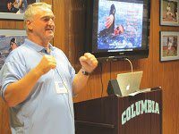 Photo shows Martin Strel speaking at the 2011 Global Open Water Swimming Conference in New York City.