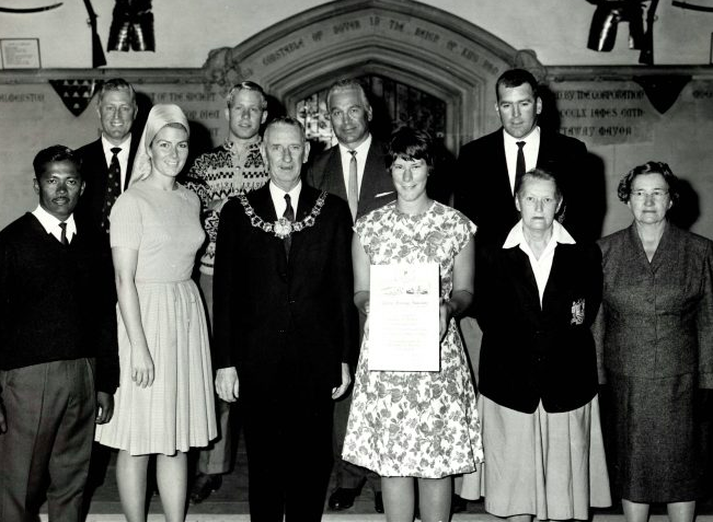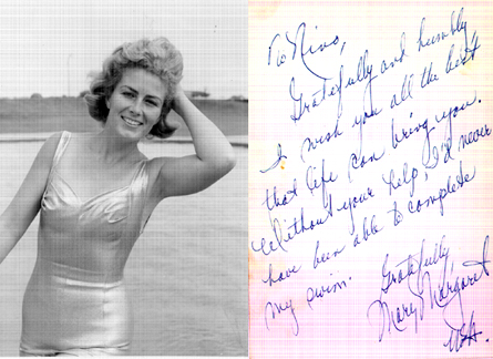 Photo above shows (back row from left) Peter Frayne, Harry Huffaker, Dr. Wilfred Slater, Hans Neukirson, and (front row from left) Abdul Malek, Mary Margaret Revell, The Mayor Councillor C.C. Chilton, Claudia Mcpherson, and I. Kellam Smith of the Channel Swimming Association Secretary.