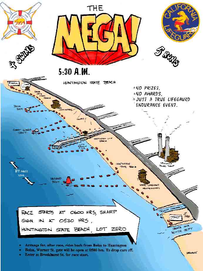 On July 14th, over a 100 lifeguards and other fit individuals will compete in the annual Mega Colossus race in Orange County, California, starting in Newport Beach, passing through Huntington Beach and ending in Bolsa Chica: a total of 8 hard miles of running on the sand with another 3 miles of ocean swimming interspersed between the run legs.