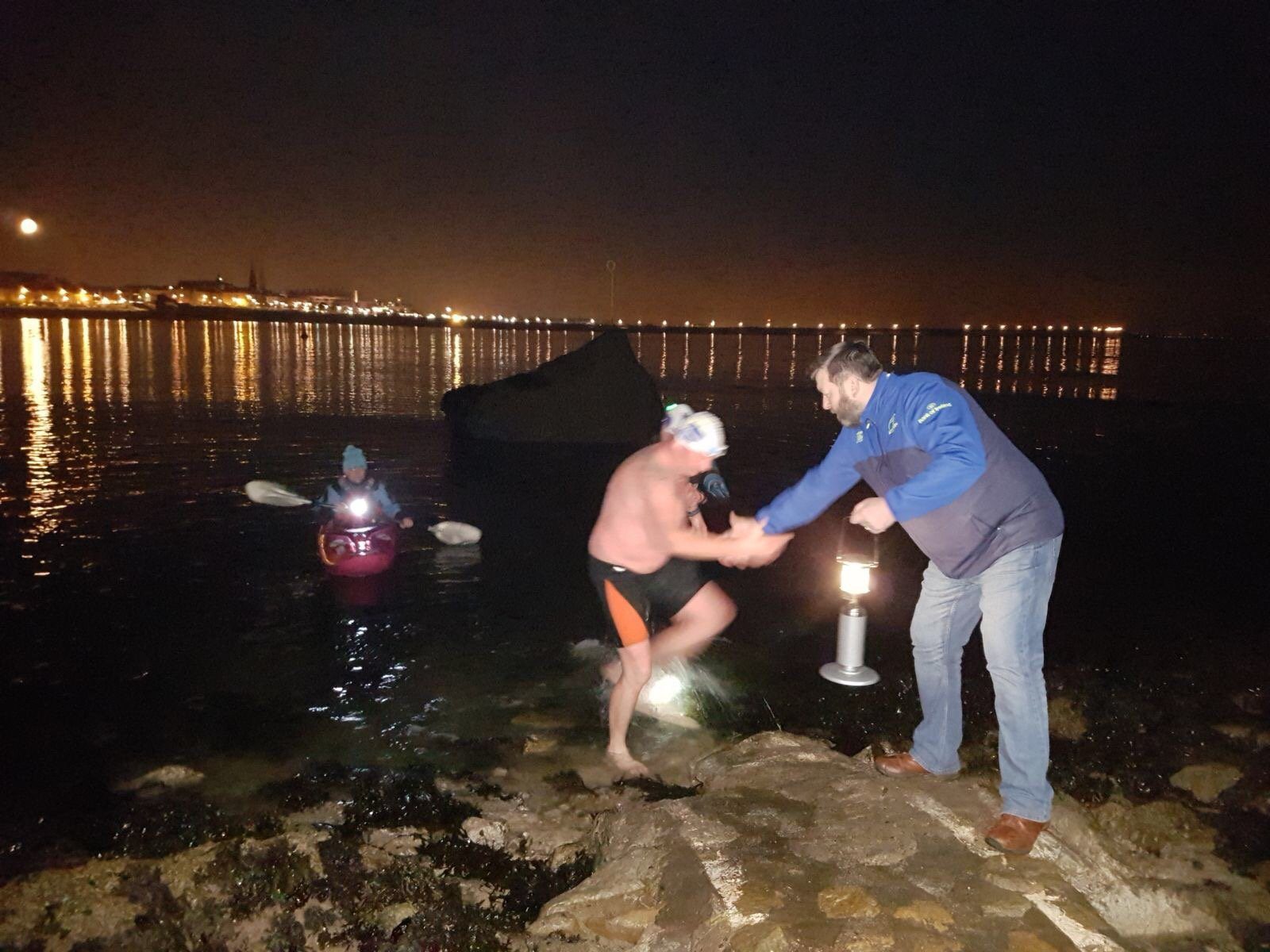 Kennedy nearly reached his physical and mental limit who swam from 8 pm to 8 am the next day. “I swam on a 1-mile course per hour format in togs only with the sea temperature at 9°C and the air temperature between 2°C and 8°C. The sea conditions were moderate. Recovery was set up in small shelter with gas heating and blankets while support was provided by fellow members of Dublin Swimming Club established in 1881.”