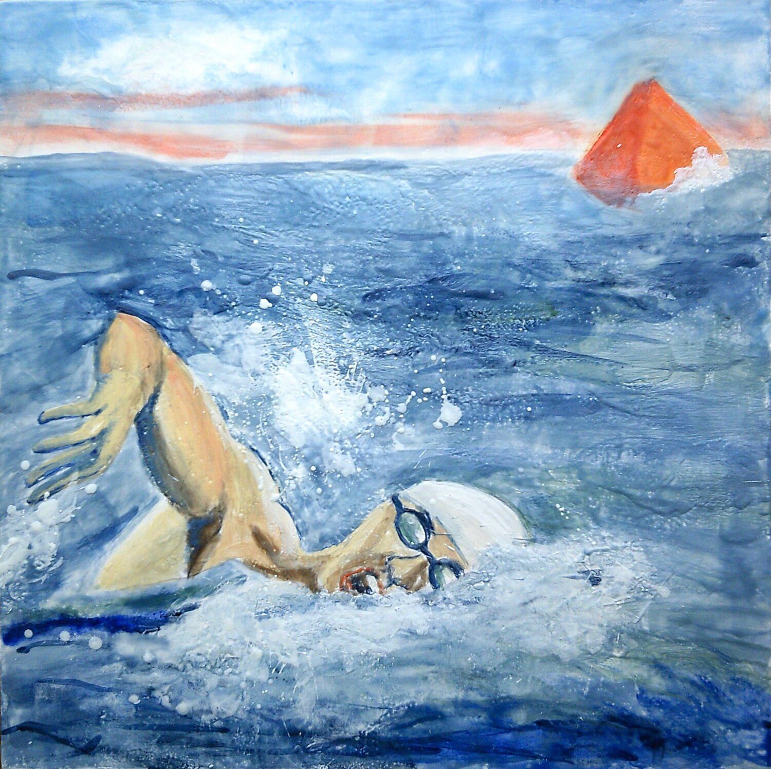 Artist and open water swimmer Michael Teters completed another painting called Reach, a 18 x 48 inch pastel and encaustic on panel [see above].