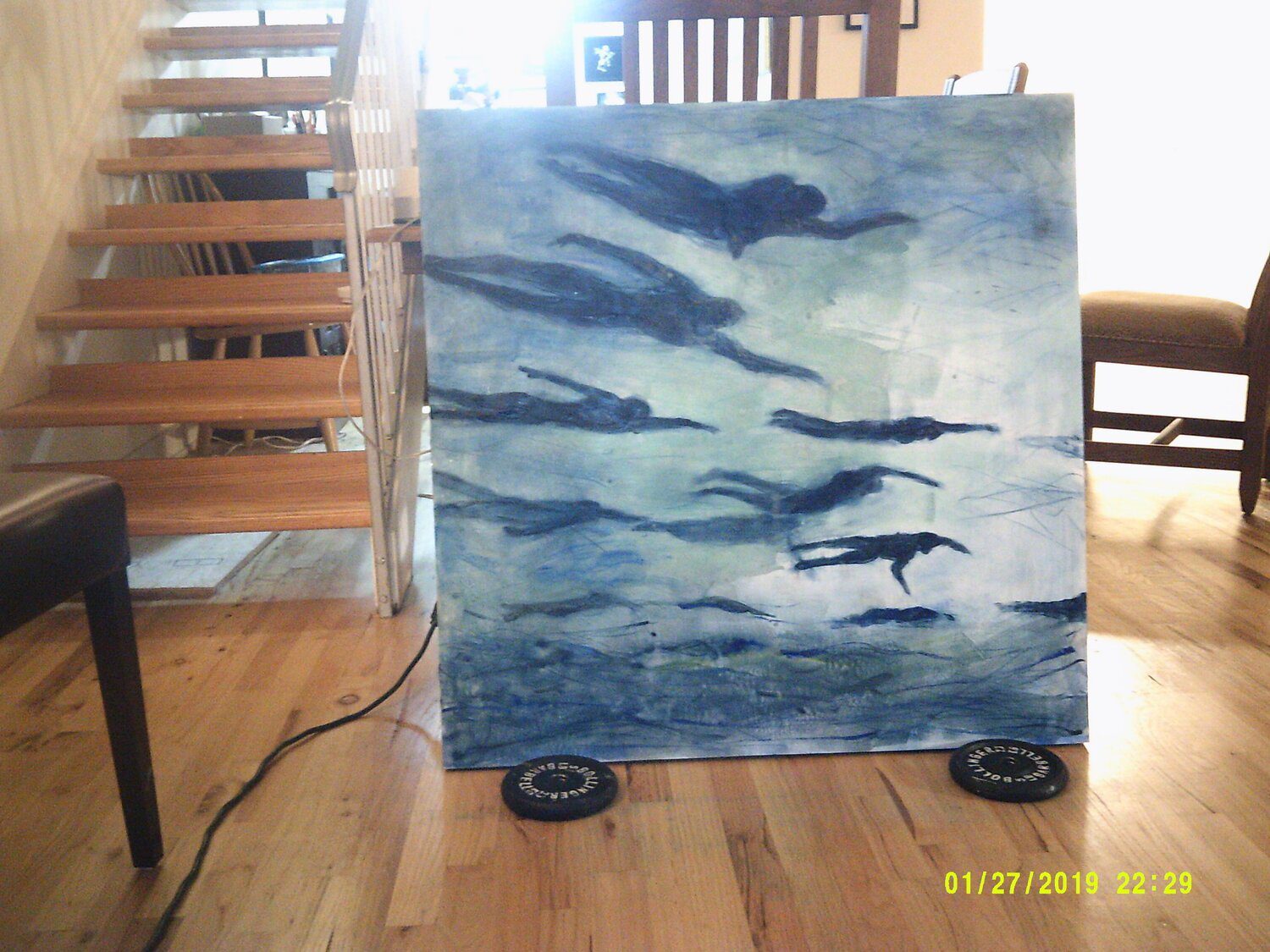 Artist and open water swimmer Michael Teters completed another painting called Reach, a 18 x 48 inch pastel and encaustic on panel [see above].