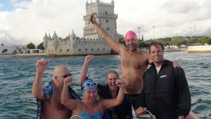 Miguel Arrobas (in jacket) is shown above with Dave Sullivan, Margie Sullivan, Simon Murie, and Louise Murie after crossing the Tagus River in Portugal in 2012.