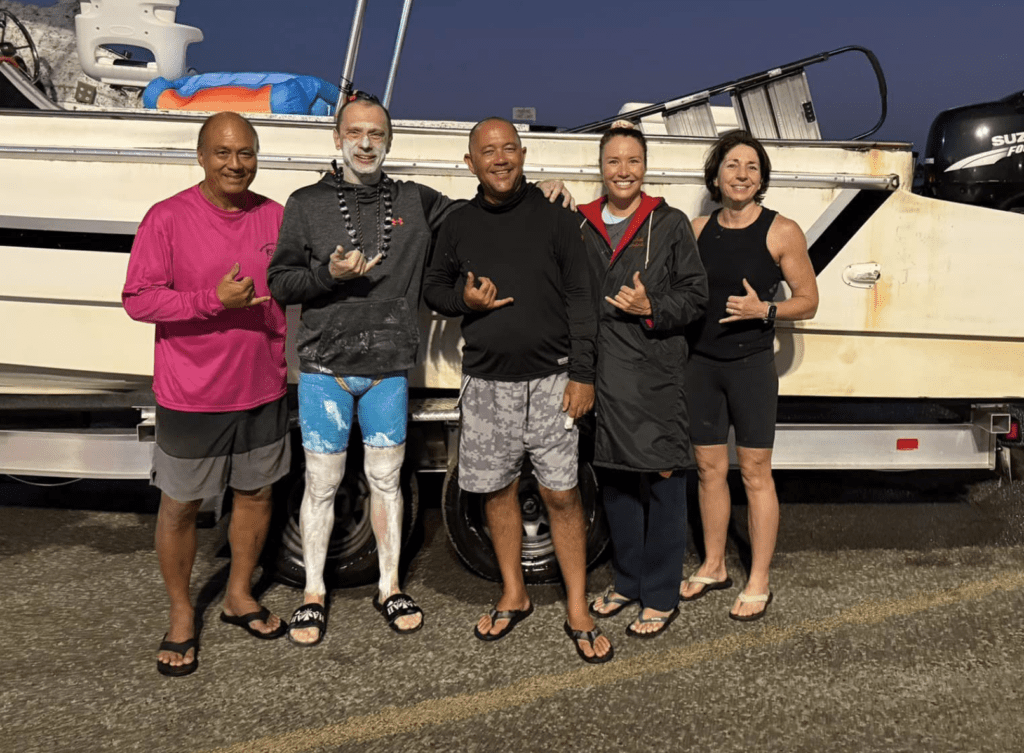 Captain Ivan Shigaki, second pilot Kevin, feeder Rachel, and wife Anne Cecile Autissier supported the 61-year-old Autissier, the oldest Molokai Channel male swimmer* in history [see support team below]. “It was brutal and I am glad it is over,” said Autissier.