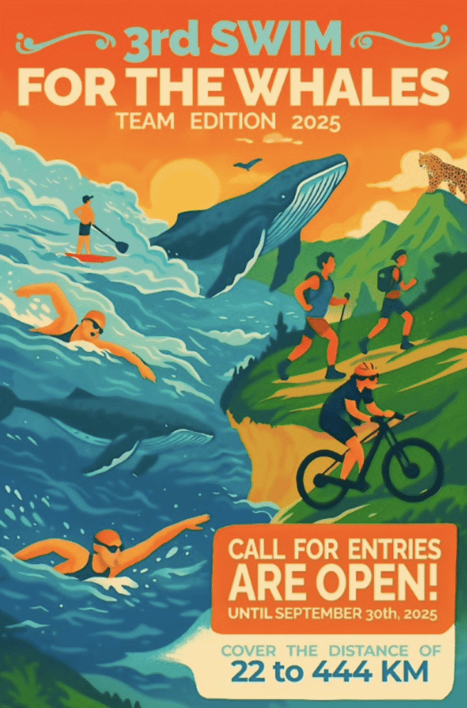 This year, she will organize the 3er Nado por las Ballenas en Equipos Internacional 2025 between November 29th to December 7th – a team-oriented event. Participate—as teams up to 10 people or as an individual—and move in the water and/or anywhere on dryland between 22 and 444 km, doing any physical activity you enjoy anywhere in the world.
