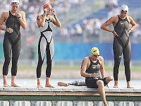 Photo by Pei Qingsheng of Natalie du Toit preparing for the start of the Olympic 10K Marathon Swim at the 2008 Beijing Olympics with her competitors beside her.
