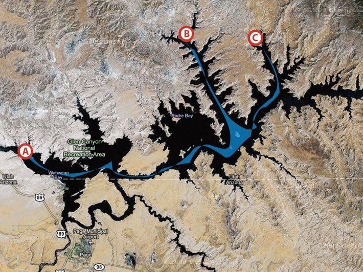 Comcast SportsNet interviewed the male swimmers of the Night Train Swimmers about their upcoming charity swim relay that begins on Friday (see here). The six-person tea will attempt to swim 108 miles in Lake Powell in the state of Arizona. The arial map on left shows the 28-mile distance from A to B and the 13-mile distance from B to C. Once at C, they will turn around and repeat the course to reach their 108-mile goal.