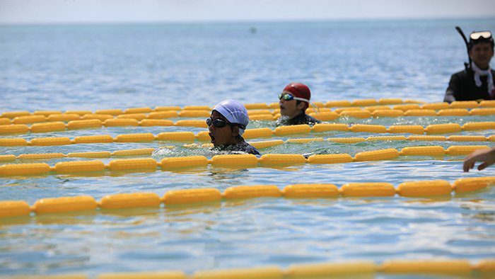 One such island, Tonakijima Island (渡名喜島) with a population of 502 people, 2 hours away from the main island of Okinawa, holds in annual summer swimming festival on Nishihama Beach. The community sets up a 25 meter course complete with lane lines and start/finish pontoons where the elementary school children can get their first taste of open water swimming in relatively shallow water. Starting with 400m and 800m swims, the young children gradually graduate to swimming without lane lines in the open ocean.