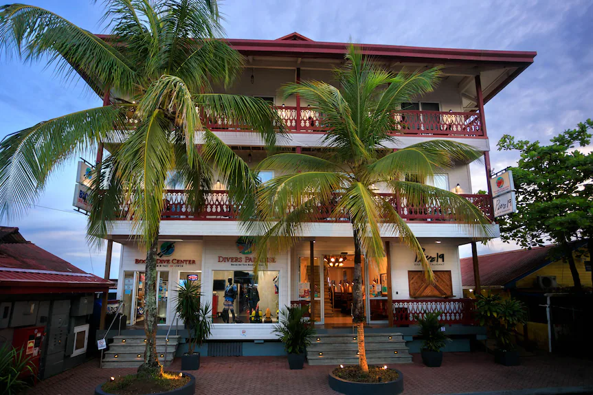 Top photo shows Turquoise Bay Dive Resort in Roatán, Honduras. Bottom photo shows Divers Paradise Boutique Hotel in Bocas del Toro, Panama.