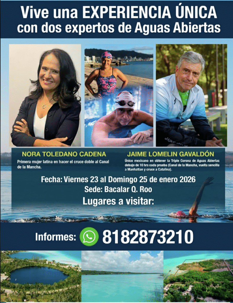 Now, Lomelin is teaming up with fellow International Marathon Swimming Hall of Fame Honor Swimmer Nora Toledano (55, Mexico, MSF bio here, @noratoledanoswim) to offer an open water swimming clinic in one of Mexico’s most idyllic locations: Bacalar Lagoon.