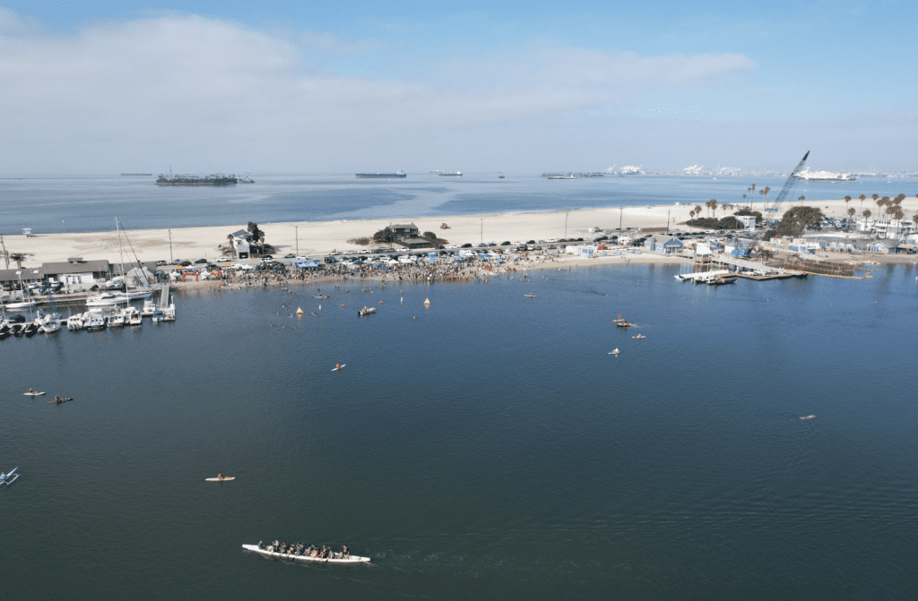 The scheduled site of the 2028 Los Angeles Olympic Games 10 km marathon swim will be Alamitos Beach in Long Beach. The beach is located within the Long Beach Breakwater – shown in the background below – where the water is nearly always glassy flat in the mornings. In the foreground is site of the Naples Island Swim.