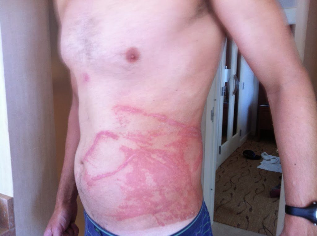 The pain was especially unforgettable when he was hit at the end of his 17 hour 2 minute Molokai Channel swim as he dragged his venom-filled torso the longest distance ever swum across the Molokai Channel. Swept past the traditional (and closest) finish point of Sandy Beach, past Portlock where Stephen Redmond, Michael Ventre and Kim Chambers landed, past the southern shores of Oahu, and finally struggling on the rocks below Diamond Head volcano, it was a swim of pain and misery. And the tentacle tattoo on his torso still exist today, over 18 months after he was hit.