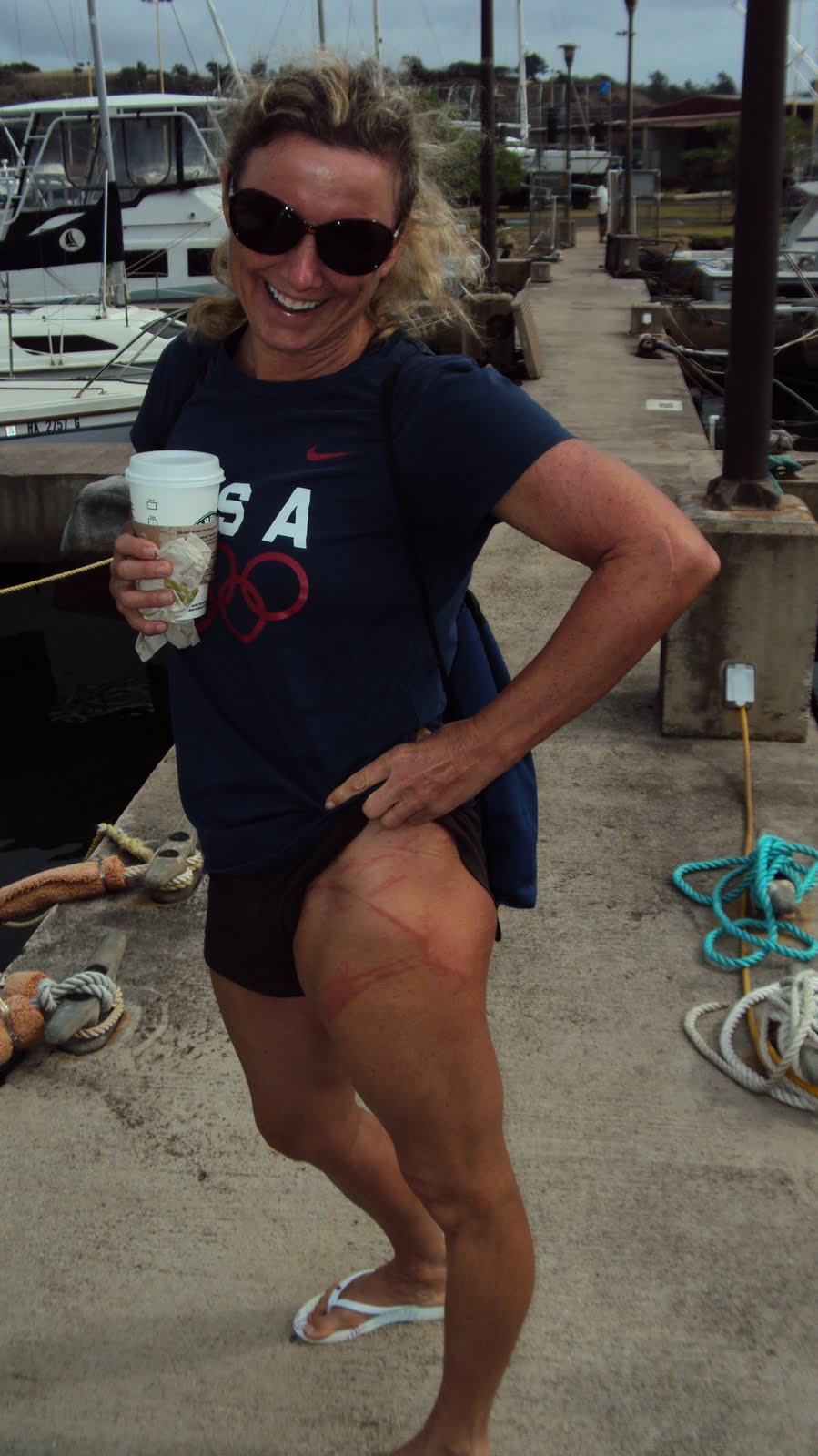 Penny Palfrey shows a few of her Portuguese Man-o-War wounds after reaching land on Kauai, but her smile remains despite her disappointment in not completing her 72-mile Kaieiewaho Channel attempt between the islands of Oahu and Kauai in Hawaii.