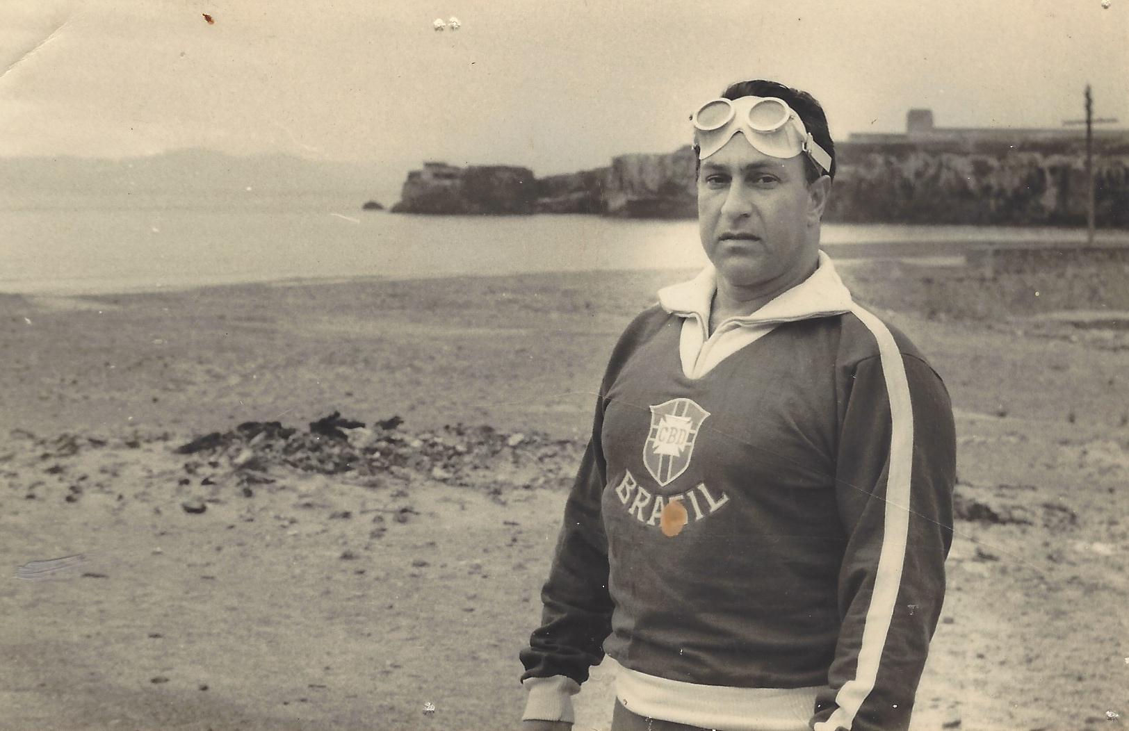 For a detailed explanation of Father O’Flanagan’s invention, read more here. International Marathon Swimming Hall of Fame Honor Swimmer Abilio Alvaro Da Costa Couto of Brazil is shown below with his goggles: