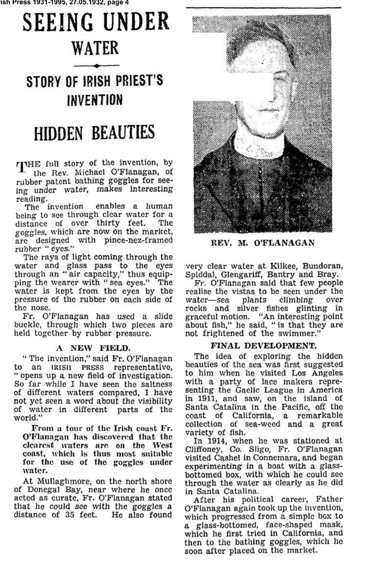 Father O’Flanagan (1876-1942) was ordained a Catholic priest in 1900 and prolific patent holder. A following article about Father O’Flanagan’s goggles appeared in the Irish Press on May 27th 1932: